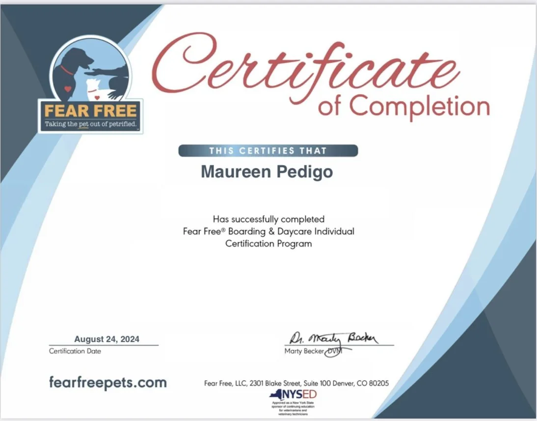 As a Fear Free Certified Professional in Boarding and Daycare every detail has been thought out from the designing of our facility to the handling and daily care of your canine companion with their physical and emotional needs as our priority. We pride ourselves on knowing we provide the “best in care” to promote the well being of your canine!